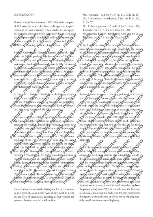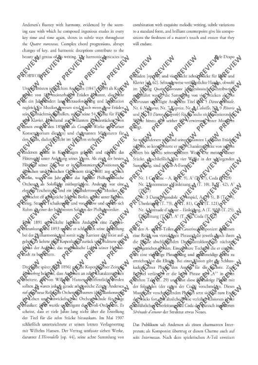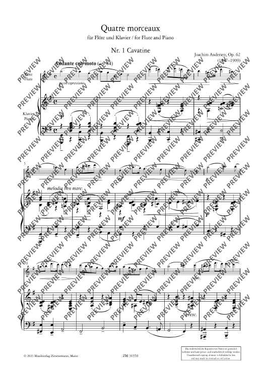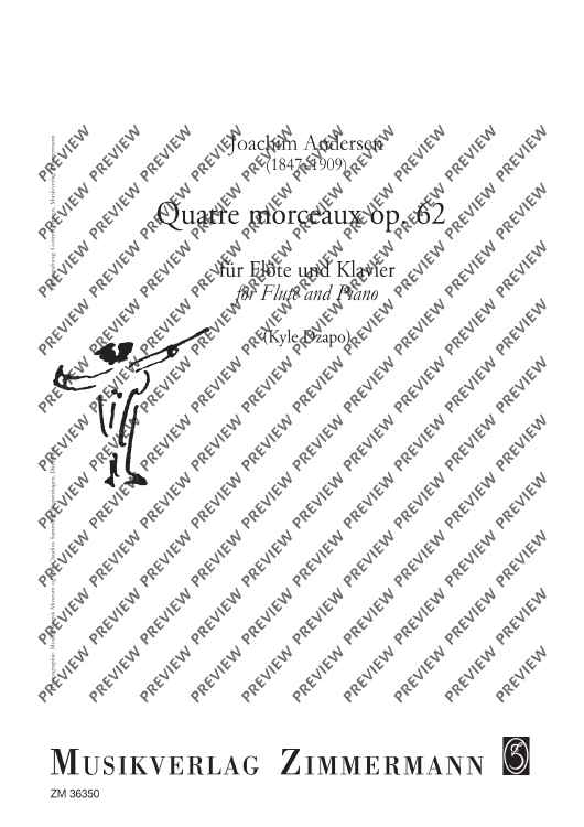 Joachim Andersen, one of the great flute virtuosos of the 19th century, is known to flutists primarily for his etudes, which have become standard repertoire. That he was also able to write charming character pieces suitable for both concerts and lessons is proven yet again in his "Quatre Morceaux" Op. 62: 1. Cavatine, 2. Intermezzo, 3. Dans la gondole, 4. Sérénade d'amour, which now appears in a new setting in the Andersen series edited by the American flutist Kyle Dzapo.