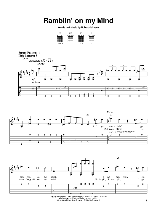 Digital Sheet Music for Ramblin' On My Mind by Eric Clapton, Robert Johnson scored for Easy Guitar Tab; id:380994