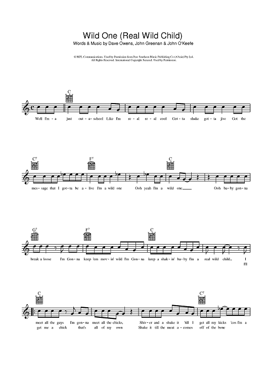 Digital Sheet Music for Real Wild Child (Wild One) by Johnny O'Keefe, Johnny Greenan, Dave Owens scored for Lead Sheet; id:401844