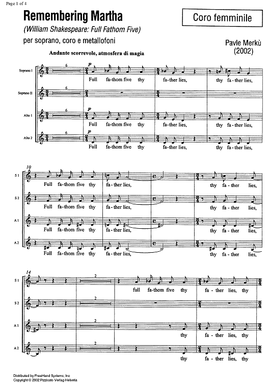 Digital Sheet Music for Remembering Martha (Wliilam Shakespeare: Full Fathom Five) - Score by Pavle Merkù scored for Soprano/Choir/Percussion; id:351476