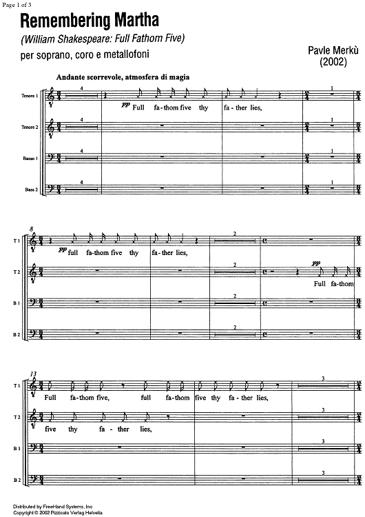 Digital Sheet Music for Remembering Martha (Wliilam Shakespeare: Full Fathom Five) - Score by Pavle Merkù scored for Soprano/Choir/Percussion; id:351477
