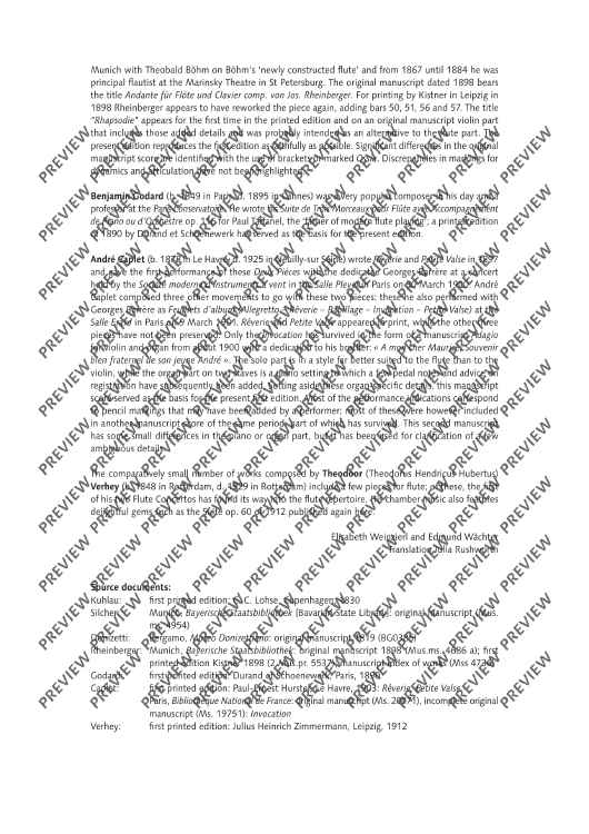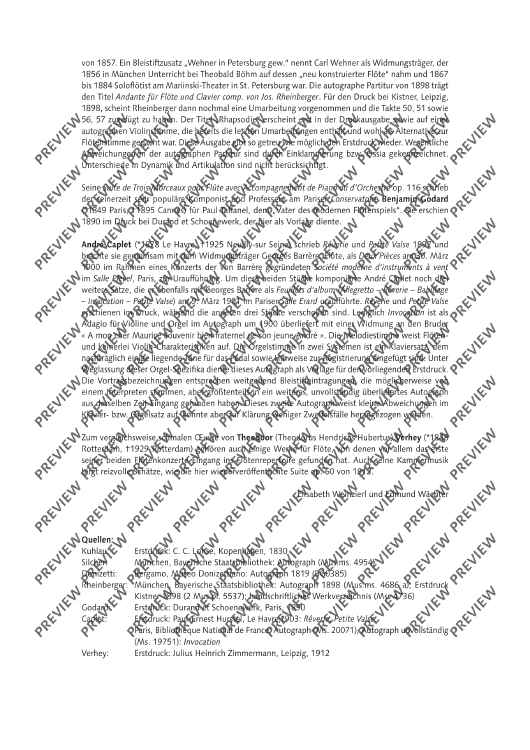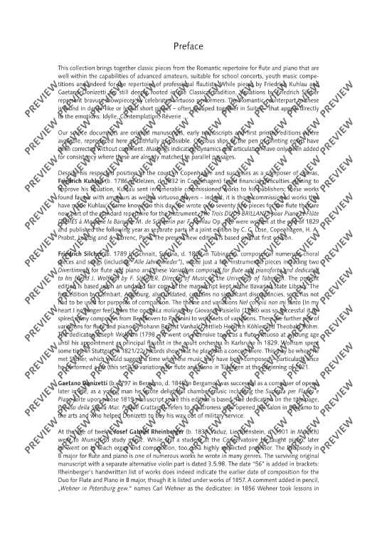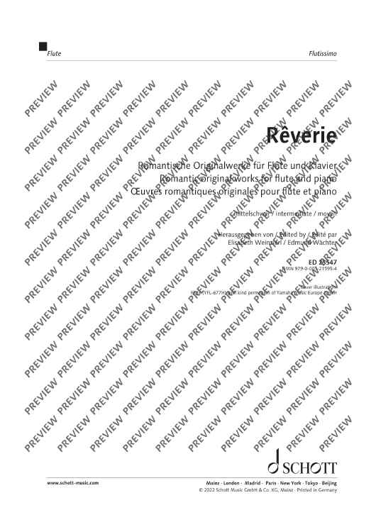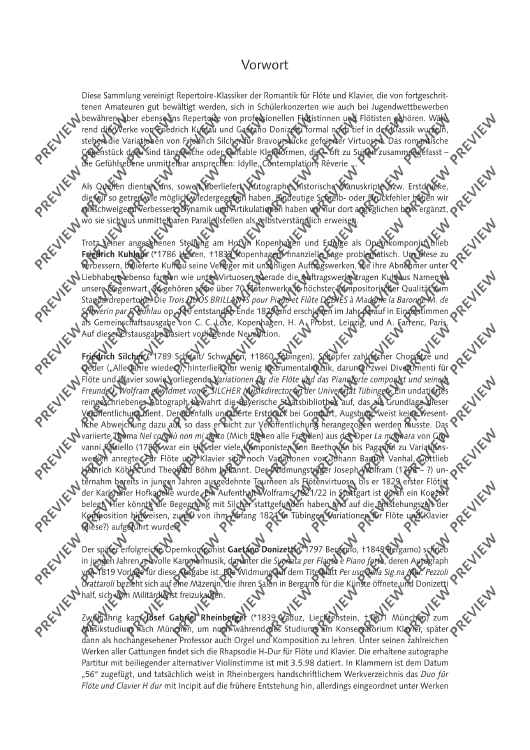 Rêverie – under the title of a typical Romantic character piece this collection brings together Romantic original works for flute and piano by Kulhau, Silcher, Donizetti, Rheinberger, Godard, Caplet, and Verhey. They are well within the capabilities of advanced amateurs, suitable for school concerts, youth music competitions and also for the repertoire of professional flautists. Autographs, historical manuscripts and first prints served as sources, as far as they have been handed down.
