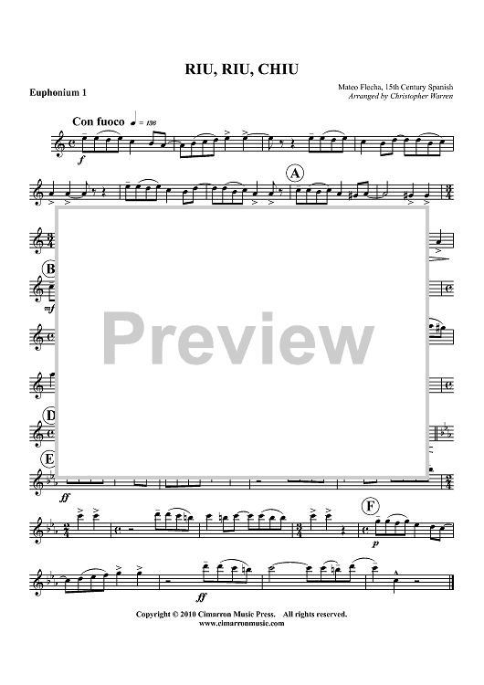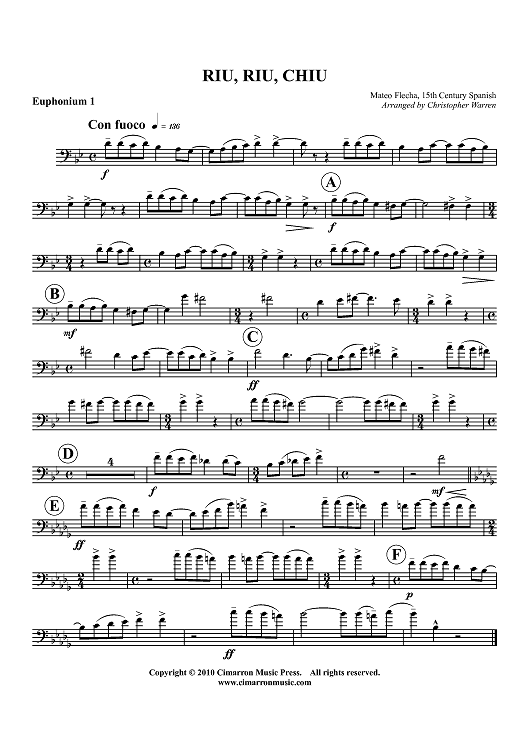 Digital Sheet Music for Riu, Riu, Riu - Euphonium 1 by Christopher Warren, Mateo Fletcha scored for Tuba Quartet; id:413379