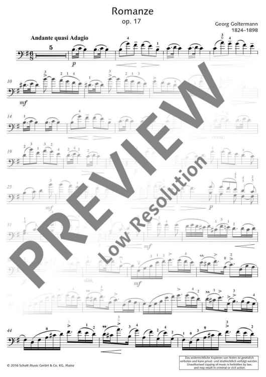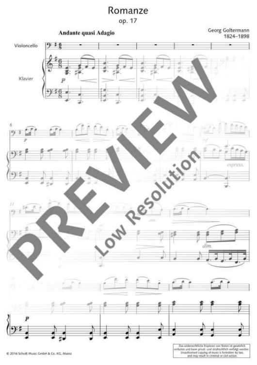 Of the compositions by Goltermann, who was a sought-after composer in the 19th century, it is particularly his cello concertos that are still remembered today and which, in his day, in some cases went to the instrument's limits with regard to technique. However, Goltermann also composed a large number of short character pieces of medium difficulty. These romances, reveries, nocturnes and serenades still enjoy great popularity in lessons and while music-making at home due to their catchy melodies and harmonies. The Romance in E minor Op. 17 was written in 1852 as an independent piece.