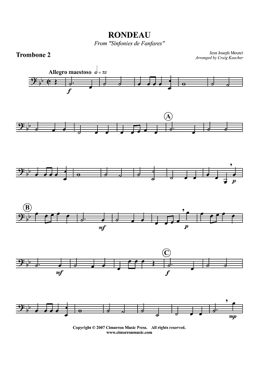 Digital Sheet Music for Rondeau - From "Sinfonies de Fanfares" - Trombone 2 by Jean-Joseph Mouret, Craig Kaucher scored for Brass Quartet; id:413895