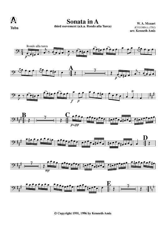 Digital Sheet Music for Rondo alla turca (Sonata in A, mvmt. 3) - Tuba by Wolfgang Amadeus Mozart, Kenneth Amis scored for Tuba/Piano; id:404095