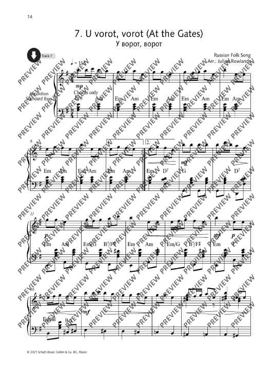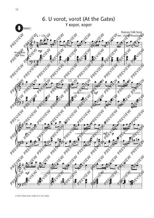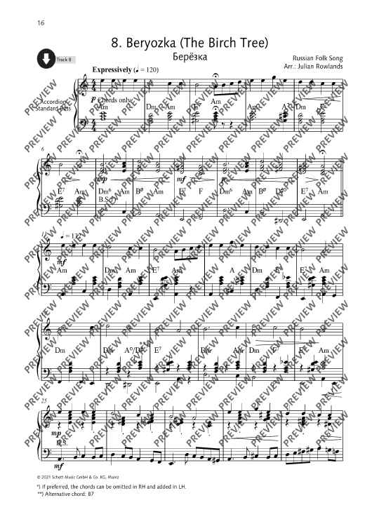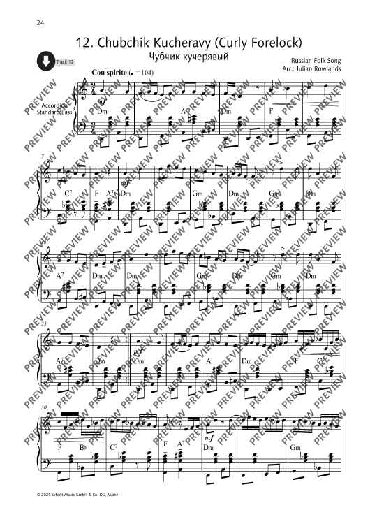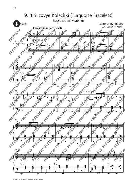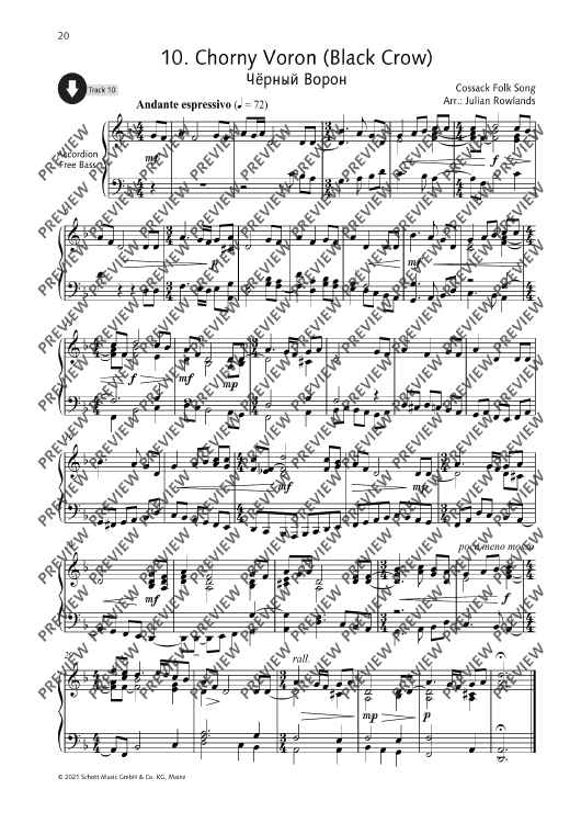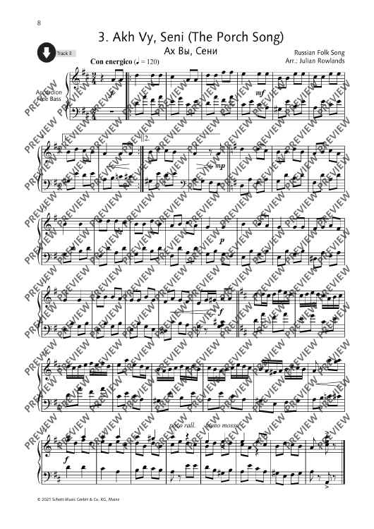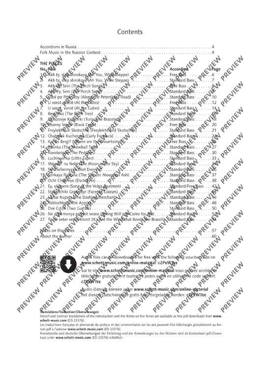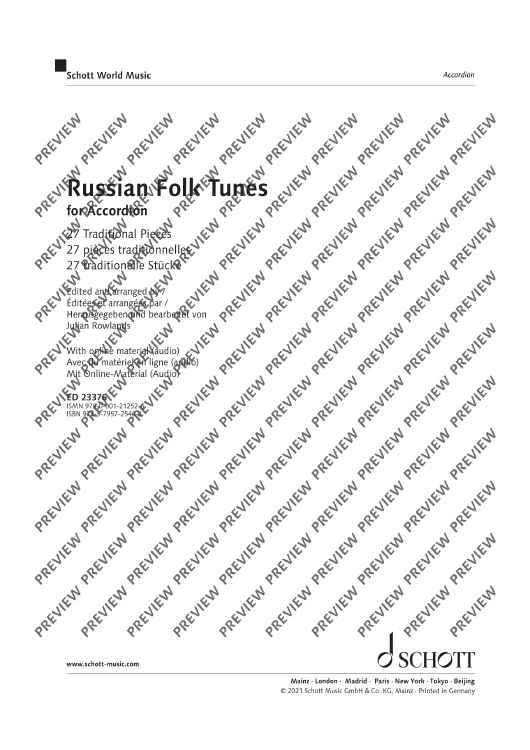Julian Rowlands presents a collection of 27 Russian folk tunes arranged for accordion. Famous tunes such as Ochi Chyornye (Dark Eyes) and Kalinka appear alongside others to discover. The collection includes notes on the history of Russian folk music, as well as notes on the single tunes. German and French translations of all texts are available as PDF. All pieces have been recorded by the editor.