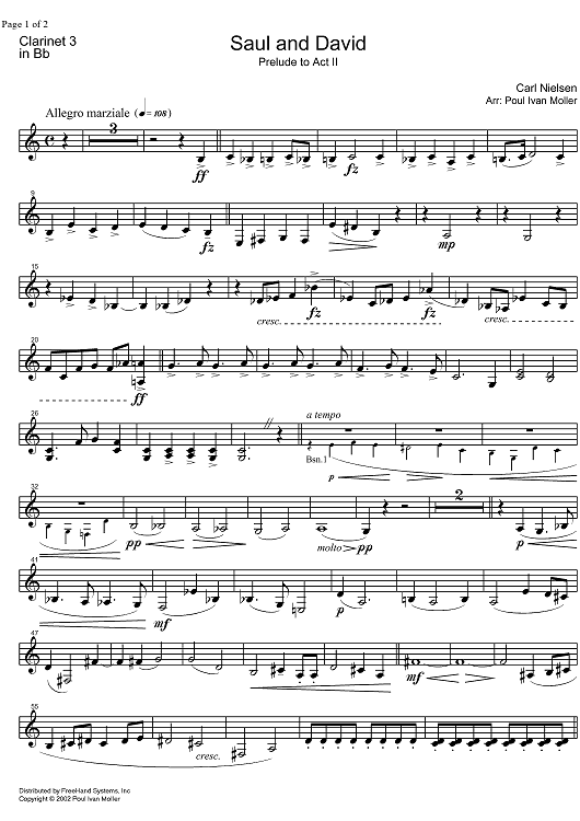 Digital Sheet Music for Saul and David - Prelude to Act 2 - Clarinet 3 by Poul Ivan Moller, Carl Nielsen scored for Concert Band; id:332100