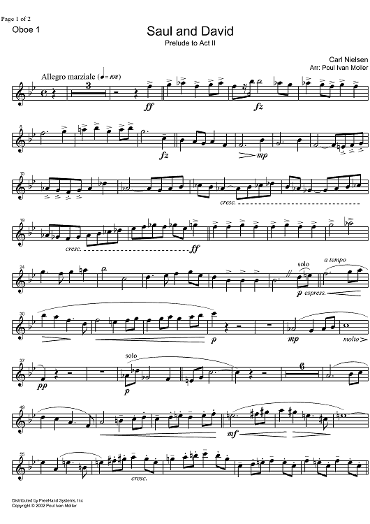 Digital Sheet Music for Saul and David - Prelude to Act 2 - Oboe 1 by Poul Ivan Moller, Carl Nielsen scored for Concert Band; id:332094
