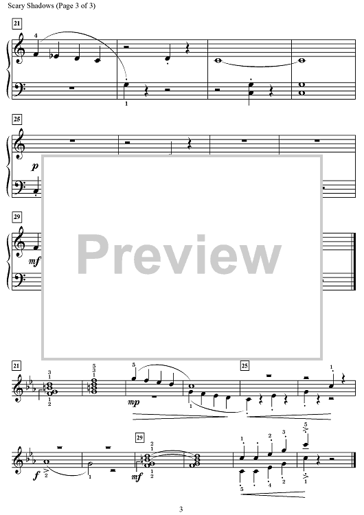 This elementary solo creates the mysterious sounds of scary shadows by placing both hands in a low register, playing staccato and legato at unexpected times, and also using accidentals. Written using an easy C minor 5-finger pattern in each hand, some cross-hand action provides excitement and adds to the mysterious mood. There is an optional teacher duet accompaniment that creates harmonic interest and rhythmic stability.