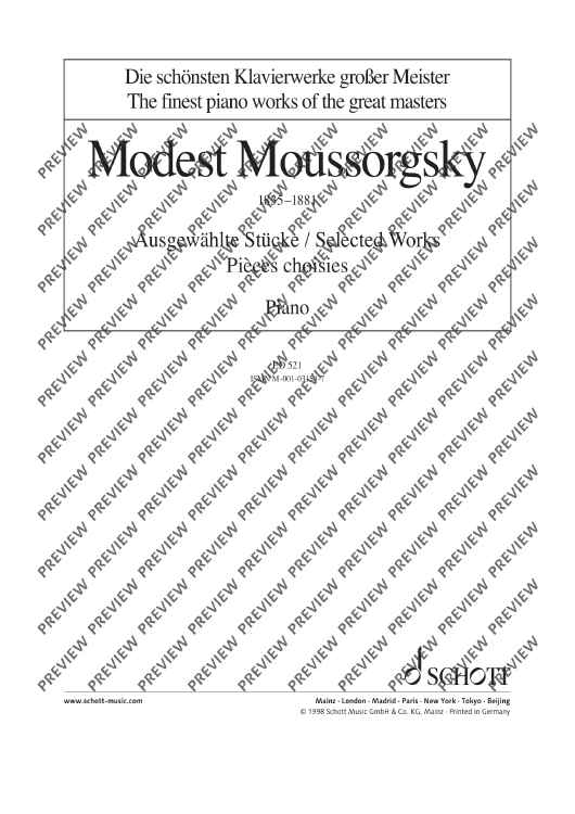 This new enlarged edition contains the easier pieces from 'Pictures at an Exhibition' (Promenade, Gnomes, Il vecchio castello, Bydlo). An ideal anthology for Mussorgsky fans and newcomers to his work.