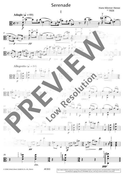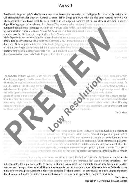 This popular piece is now available in a version for viola. In close collaboration with Henze, the arranger Garth Knox created an edition in which the dynamics and phrasing have been made more precise and the notation been optimized. The arranger writes: "I am convinced that this colourful "miniature dance suite" will be a valuable addition to the viola repertoire - and also an important step toward the future for all musicians who want to know what to expect after Bach, Reger and Hindemith.'