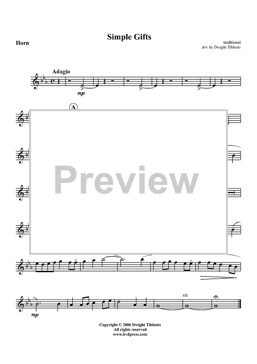 Digital Sheet Music for Simple Gifts - Horn by Dwight Tibbetts, Traditional scored for Brass Quintet; id:319012