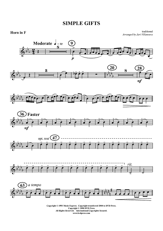 Digital Sheet Music for Simple Gifts - Horn by Traditional, Jari Villanueva scored for Brass Quintet; id:405095