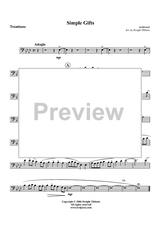 Digital Sheet Music for Simple Gifts - Trombone by Dwight Tibbetts, Traditional scored for Brass Quintet; id:319013