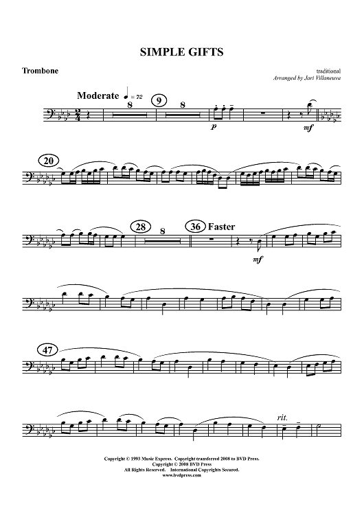 Digital Sheet Music for Simple Gifts - Trombone by Traditional, Jari Villanueva scored for Brass Quintet; id:405096