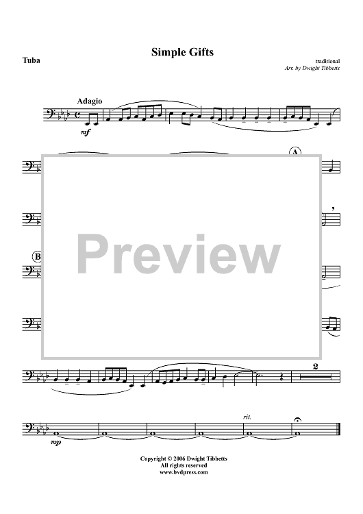 Digital Sheet Music for Simple Gifts - Tuba by Dwight Tibbetts, Traditional scored for Brass Quintet; id:319014