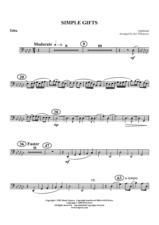 Digital Sheet Music for Simple Gifts - Tuba by Traditional, Jari Villanueva scored for Brass Quintet; id:405097