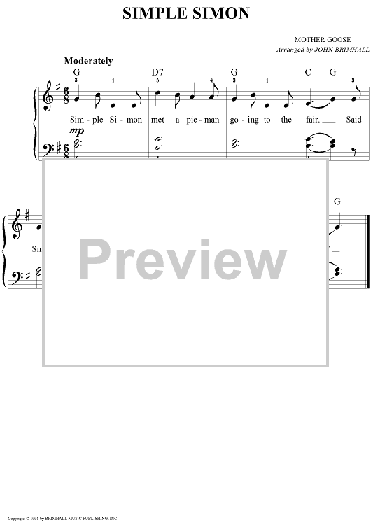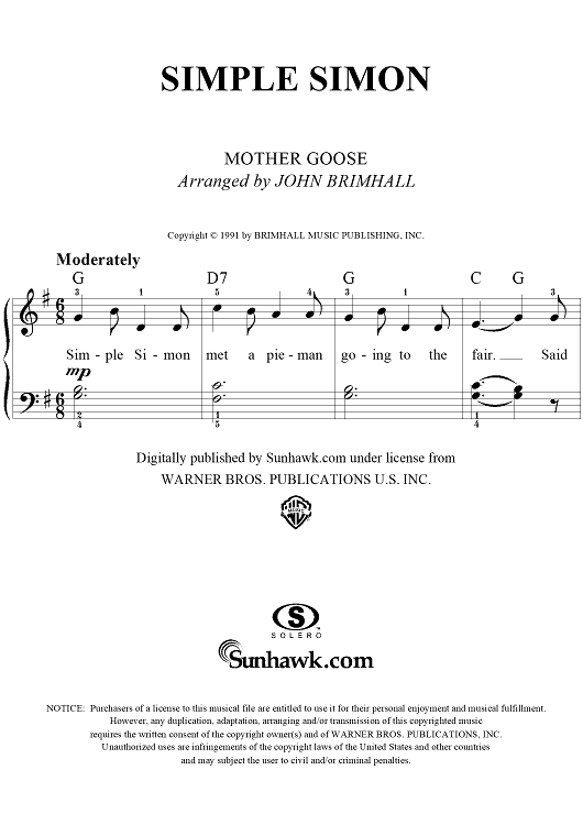 Digital Sheet Music for Simple Simon by John Brimhall, Mother Goose scored for Easy Piano/Vocal; id:252601