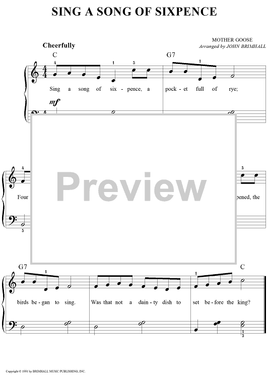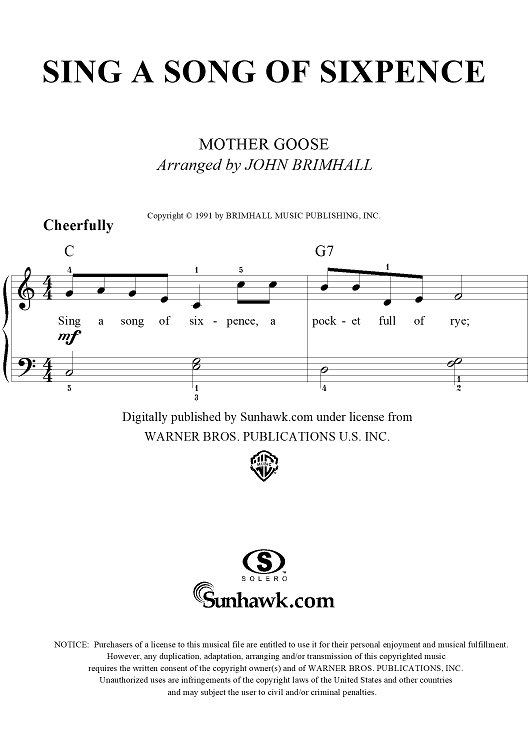 Digital Sheet Music for Sing a Song of Sixpence by John Brimhall, Mother Goose scored for Easy Piano/Vocal; id:252593