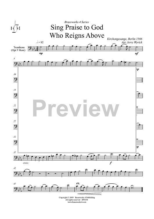 Digital Sheet Music for Sing Praise To God Who Reigns Above - Trombone by Jerry Wyrick, Berlin Kirchengesange scored for Brass Quartet; id:411291