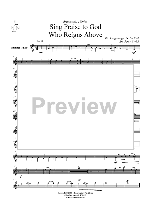 Digital Sheet Music for Sing Praise To God Who Reigns Above - Trumpet 1 in B-flat by Jerry Wyrick, Berlin Kirchengesange scored for Brass Quartet; id:411286