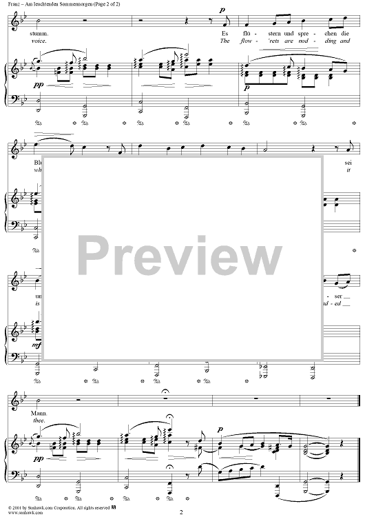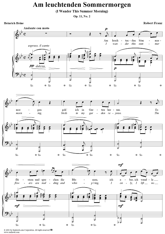 Digital Sheet Music for Six Lieder, Op. 11, No. 2: I Wander This Summer Morning (Am leuchtenden Sommermorgen) by Robert Franz, Heinrich Heine scored for Voice/Piano; id:268907