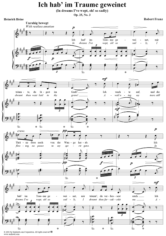 Digital Sheet Music for Six Lieder, op. 25, no. 3: In Dreams I've Wept, oh! so sadly (Ich hab' im Traume geweinet) by Robert Franz, Heinrich Heine scored for Voice/Piano; id:269281