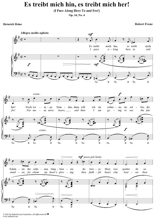 Digital Sheet Music for Six Lieder, op. 34, no. 4: I Pace Along Here To and Fro! (Es treibt mich hin, es treibt mich her!) by Robert Franz, Heinrich Heine scored for Voice/Piano; id:269143