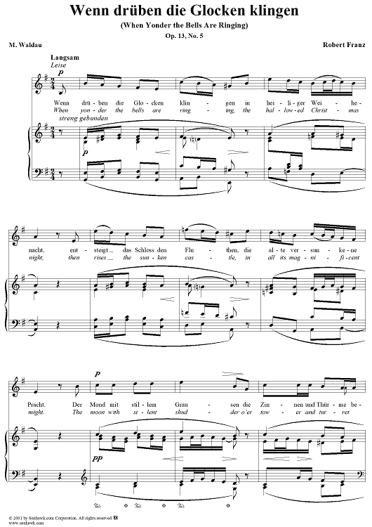 Digital Sheet Music for Six Poems, op. 13, no. 5: When Yonder the Bells Are Ringing (Wenn drüben die Glocken klingen) by Robert Franz, M. Waldau scored for Voice/Piano; id:268934