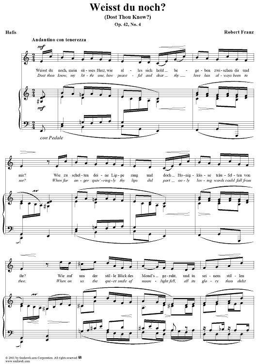 Digital Sheet Music for Six Songs from the East, op. 42, no. 4: Dost Thou Know? (Weisst du noch?) by Robert Franz, Hafis scored for Voice/Piano; id:269279