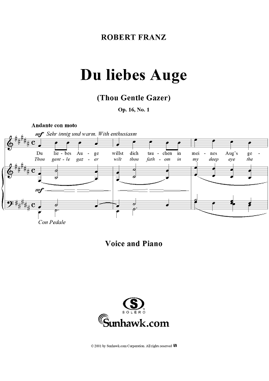 Digital Sheet Music for Six Songs, op. 16, no. 1: Thou Gentle Gazer (Du liebes Auge) by Robert Franz, Otto Roquette scored for Voice/Piano; id:269051