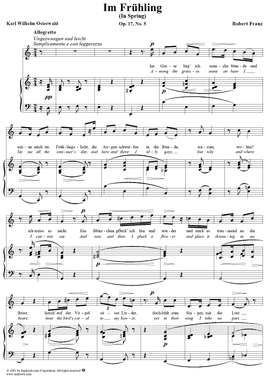 Digital Sheet Music for Six Songs, op. 17, no. 5: In Spring (Im Frühling) by Robert Franz, Karl Wilhelm Osterwald scored for Voice/Piano; id:269055