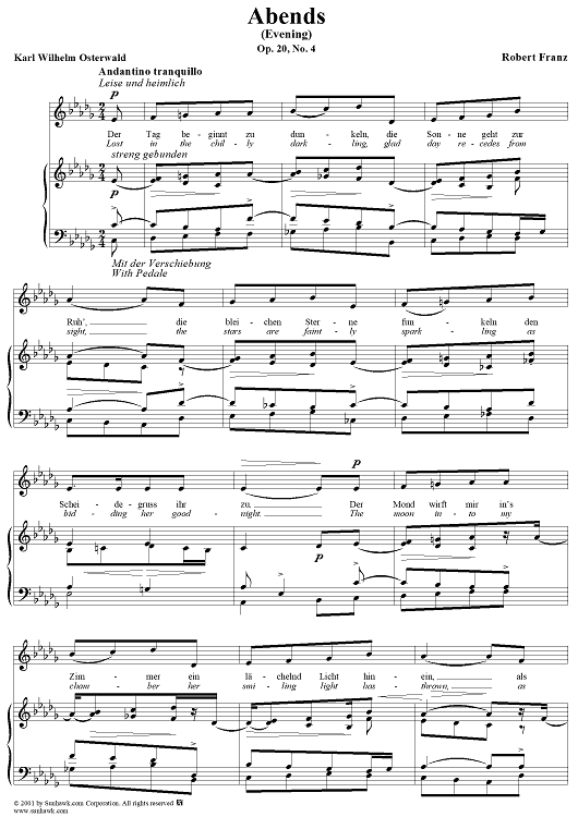 Digital Sheet Music for Six Songs, op. 20, no. 4: Evening (Abends) by Robert Franz, Karl Wilhelm Osterwald scored for Voice/Piano; id:269265