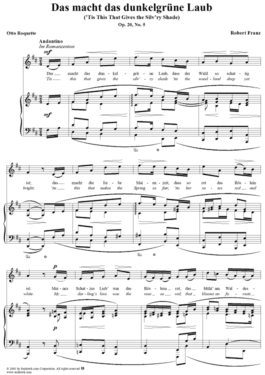 Digital Sheet Music for Six Songs, op. 20, no. 5: 'Tis This That Gives the Silv'ry Shade (Das macht das dunkelgrüne Laub) by Robert Franz, Otto Roquette scored for Voice/Piano; id:268877