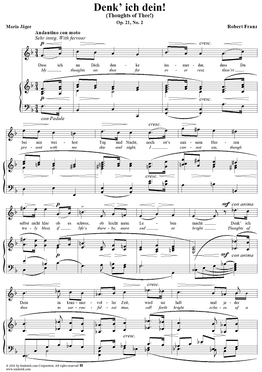 Digital Sheet Music for Six Songs, op. 21, no. 2: Thoughts of Thee! (Denk' ich dein!) by Robert Franz, Maria Jäger scored for Voice/Piano; id:268900