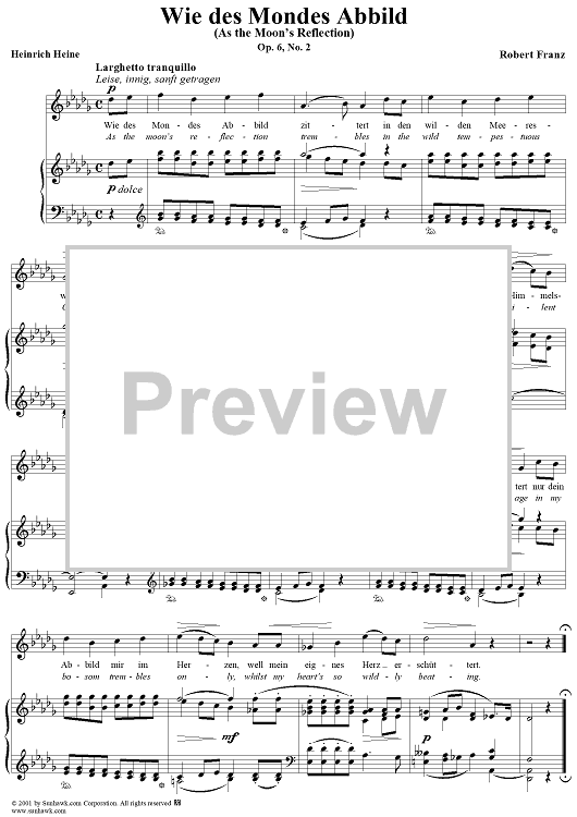 Digital Sheet Music for Six Songs, op. 6, no. 2: As the Moon's Reflection (Wie des Mondes Abbild) by Robert Franz, Heinrich Heine scored for Voice/Piano; id:269150