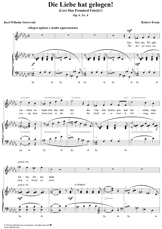 Digital Sheet Music for Six Songs, op. 6, no. 4: Love Has Promised Falsely! (Die Liebe hat gelogen!) by Robert Franz, Karl Wilhelm Osterwald scored for Voice/Piano; id:269301