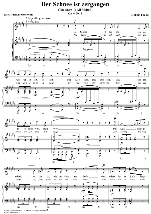 Digital Sheet Music for Six Songs, op. 6, no. 5: The Snow Is All Melted (Der Schnee ist zergangen) by Robert Franz, Karl Wilhelm Osterwald scored for Voice/Piano; id:268879