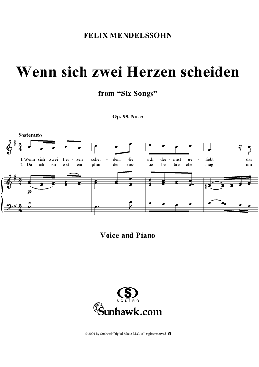 Digital Sheet Music for Six Songs, Op. 99, No. 5: "Farewell" (Wenn Sich Zwei Herzen Scheiden) by Felix Mendelssohn scored for Voice/Piano; id:251994