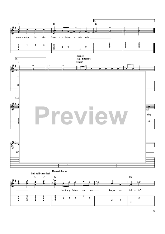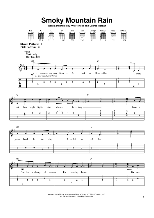 Digital Sheet Music for Smoky Mountain Rain by Ronnie Milsap, Kye Fleming, Dennis Morgan scored for Easy Guitar Tab; id:393022