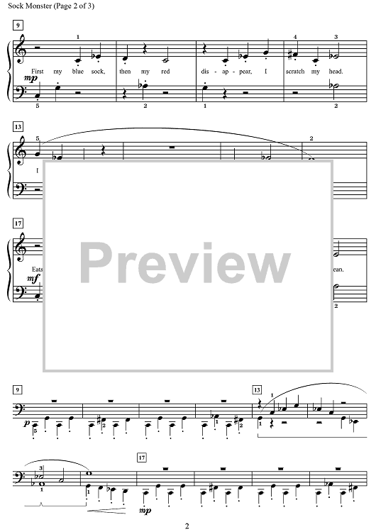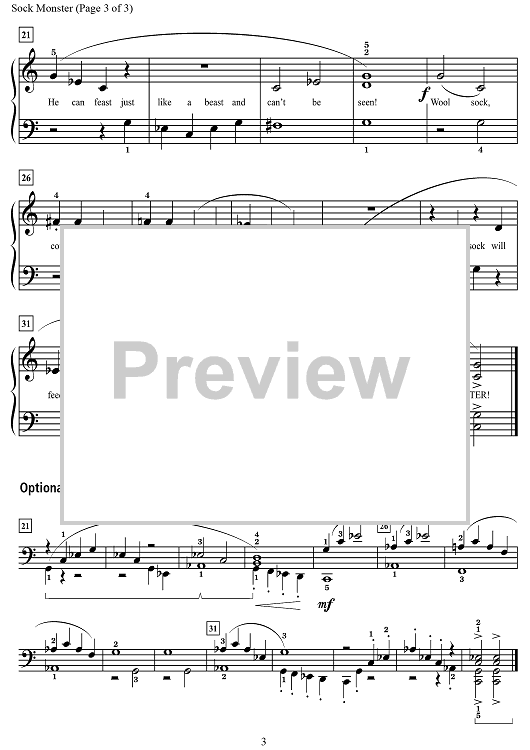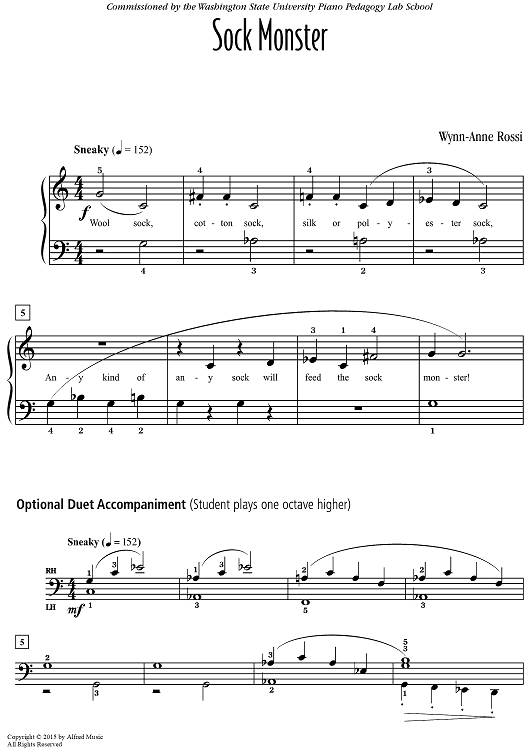 Sock Monster begins in middle C position but ends in C 5-finger pattern. This elementary song contains many accidentals and mixed articulations. Finger 2 crosses over the thumb frequently in the left hand. Both hands play together often, and motion is mainly by skips. Lyrics and an optional duet accompaniment are included.