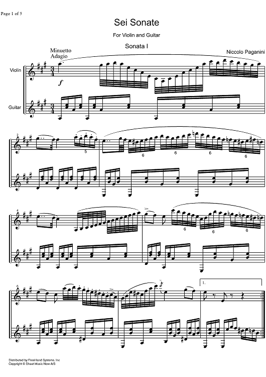 Digital Sheet Music for Sonata A Major Op. 2 No. 1 - Score by Niccolò Paganini scored for Violin/Guitar; id:322754