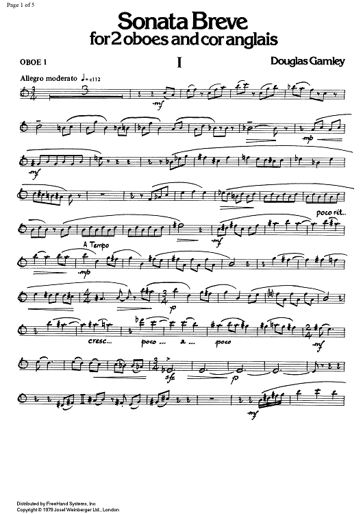 Digital Sheet Music for Sonata Breve - Oboe 1 by Douglas Gamley scored for 2 Oboes/English Horn; id:335953