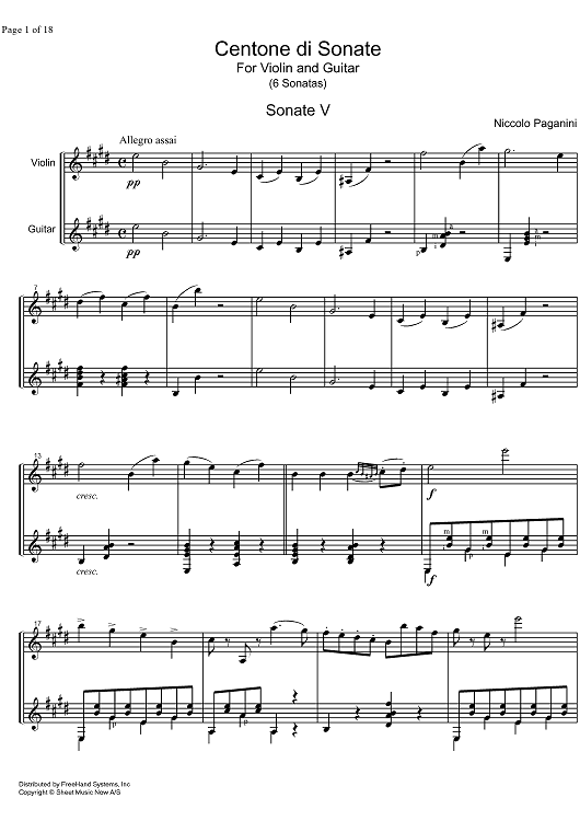Digital Sheet Music for Sonata E Major - Score by Niccolò Paganini scored for Violin/Guitar; id:322794