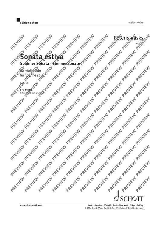 Sonata estiva for solo violin by Peteris Vasks unfolds a powerful world of sound that captures the beauty of nature and the emotions of summer.The two fast outer movements are playful, dancing and lively, while the slow middle movement demands sonorous expressiveness from the violin.