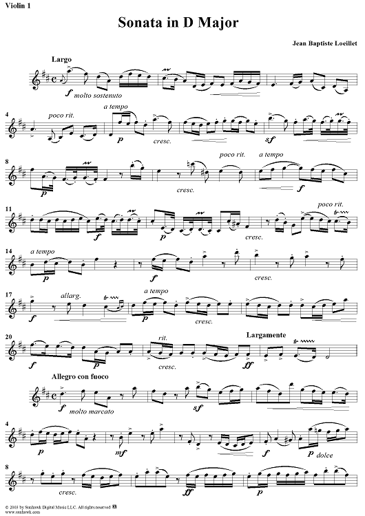"Sonata in D Major - Violin 1" Sheet Music by Jean Baptiste Loeillet