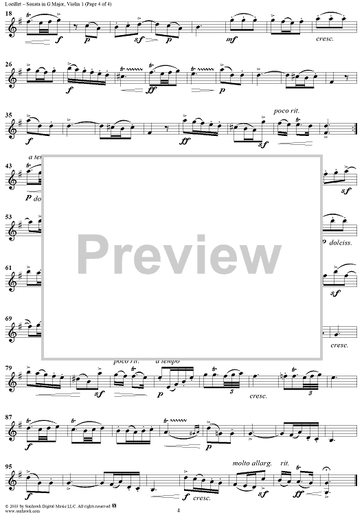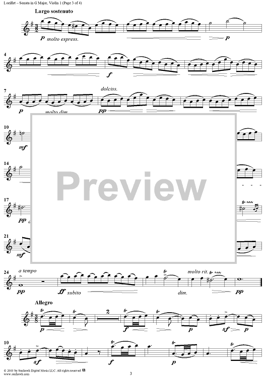Digital Sheet Music for Sonata in G Major - Violin 1 by Jean Baptiste Loeillet scored for Two Violins/Piano; id:295139