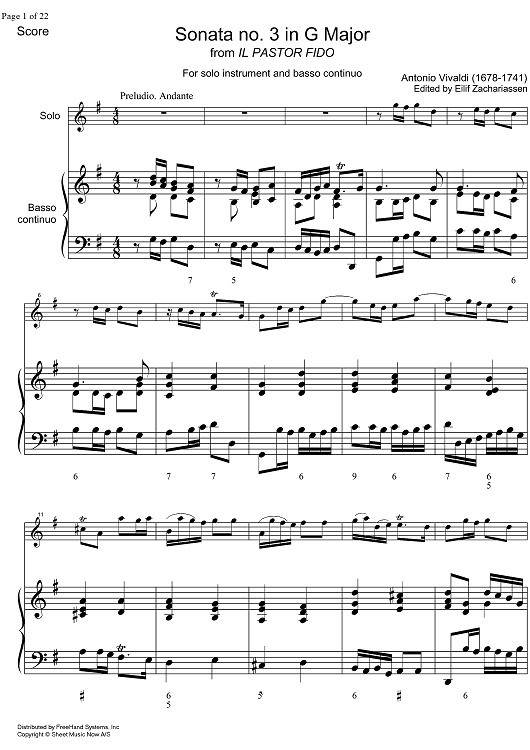 Digital Sheet Music for Sonata No. 3 G Major - Score by Antonio Vivaldi, Eilif Zachariassen scored for 1 Instrument/Continuo; id:327740