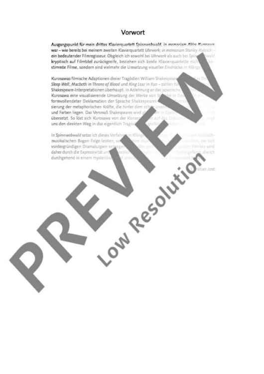 Jost's piano quartet is an homage to the outstanding Japanese film director Akira Kurosawa and his adaptations of three Shakespeare tragedies ('Hamlet', 'King Lear', 'Macbeth'). Although 'Spinnwebwald' falls back on Kurosawa's film title 'Das Schloss im Spinnwebwald' ('Macbeth'), the work not only refers to a single film but also expresses the prevailing mood. In accordance with Kurosawa's conversion of language into gestures, the composer manages, with plenty of imagination, to convert visual impressions into expressive colourful sounds which captivate players and listeners alike.